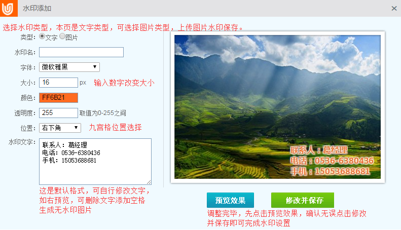 圖片添加具體操作方法:先對圖片進行水印設置,我們可把圖片設置成文字和圖片兩種水印,文字水印較為簡單,通過參數設置,設置好了,點擊預覽后保存即可。